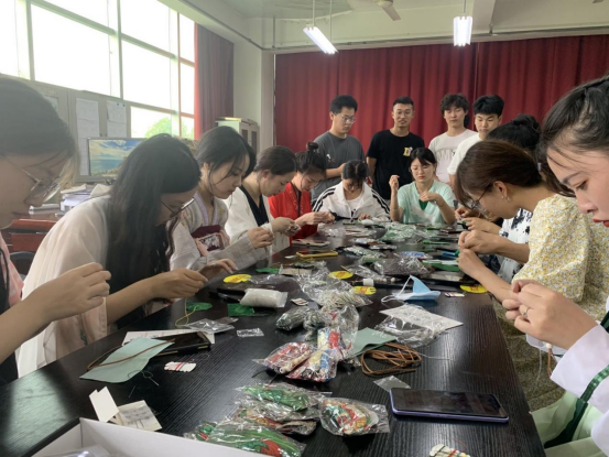 接下来是本次活动的重点环节——缝制香囊。活动现场一共给大家提供了八种不同造型的香囊布料、五种不同味道的香料以及各种流苏、木珠、彩色针线等材料。大家可以跟着教学视频学习缝制,也可以自行发挥创造。活动中,大家飞针走线,五颜六色的布料、彩绳、丝线、香料共同交织成一幅节日气氛浓厚的文化绘卷。不一会很多老师和同学便做成了一个个驱蚊环保、美观实用的香囊。香囊承载着民族传统文化,做香囊更是端午节的重要习俗之一,大家在制作香囊的过程中再次感受到了传统文化的魅力。