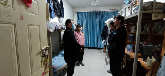 每走进一个宿舍,院领导都叮嘱员工要安全用电,自觉遵守学院各项防控和安全管理的规章制度,鼓励同学们既要勤奋学习,也要锻炼好身体,有困难及时向辅导员老师和学院领导反映。