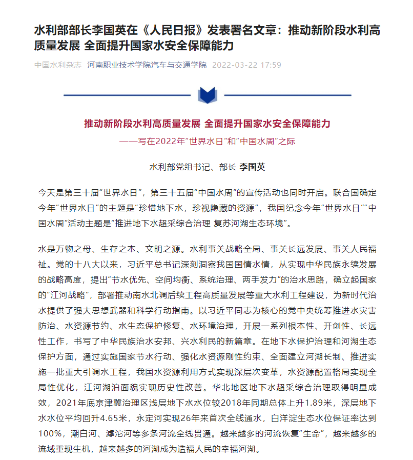 3月22日“世界水日”当天,suncitygroup太阳集团公众号转发学习了水利部部长李国英在《人民日报》发表署名文章:推动新阶段水利高质量发展全面提升国家水安全保障能力,坚持以习近平新时代中国特色社会主义思想为指导,深入学习贯彻习近平总书记关于“珍惜地下水,珍视隐藏的资源”、“推进地下水超采综合治理 复苏河湖生态环境”等工作的重要指示精神。